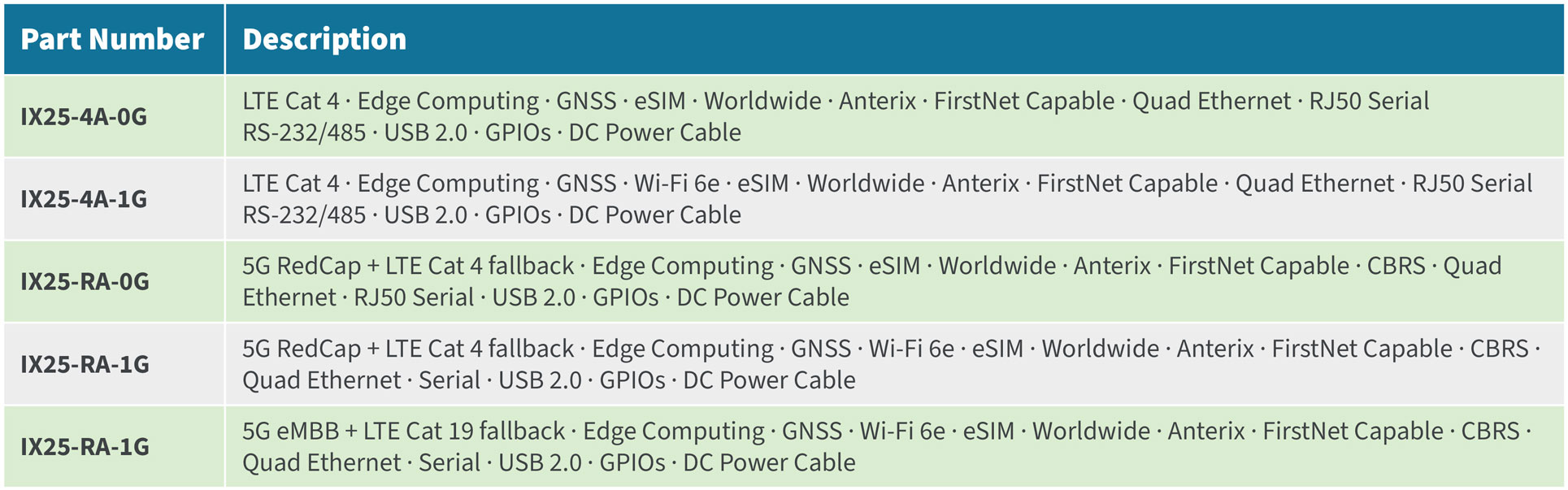 Digi IX25 共有五种型号,支持:
