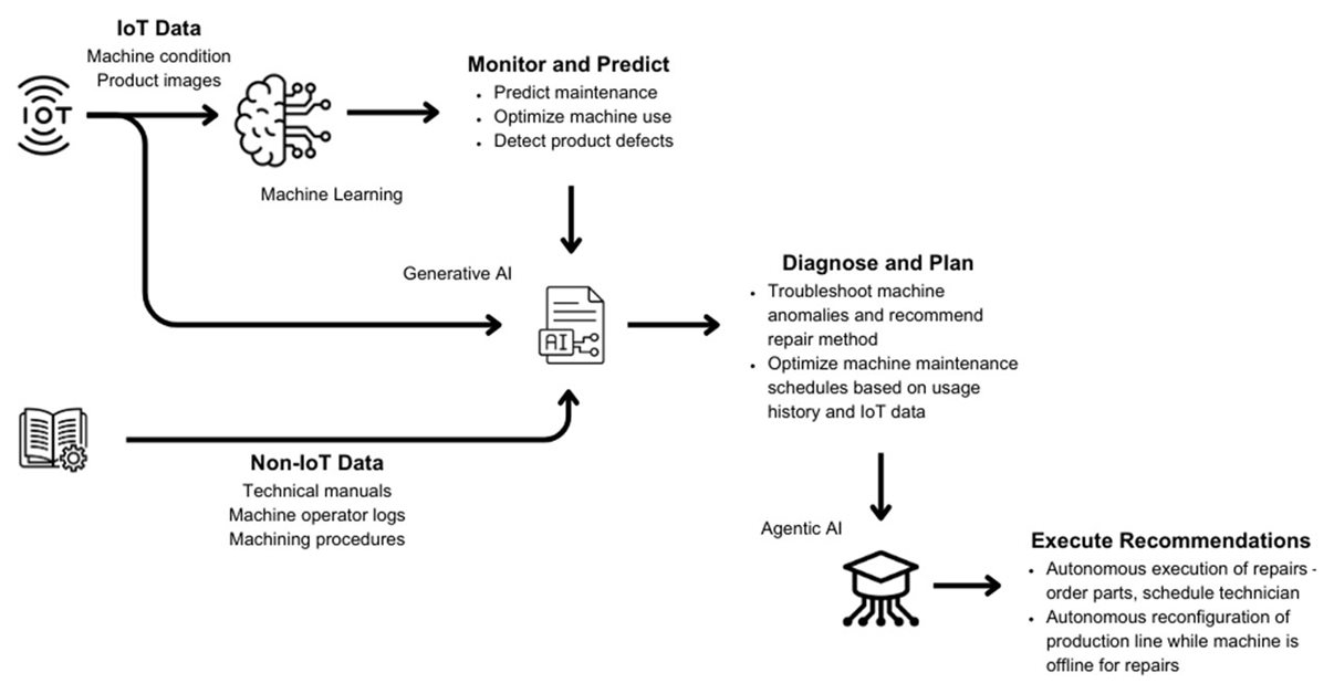 生成式人工智能通过整合传感器数据、运行日志和人类输入,进一步拓展了这些能力,能够诊断异常、规划优化策略并提出行动建议。新兴的智能体人工智能方法旨在超越建议层面,实现运营工作流的协调与执行。