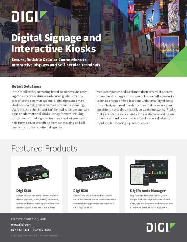 通过高速蜂窝连接和集成的Digi Remote Manager®,您可以动态定制标牌信息,随时查看部署的设备,并确保所有显示屏都连接在一起。Digi 提供各种专用路由器选件和嵌入式产品,以满足您在全球范围内的部署要求。